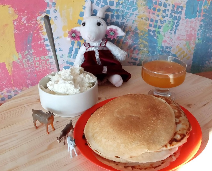 С сыворотки приготовились блины, на фото наш домашний творог и мёд. Моя новая кукла коза Аська от Ольги